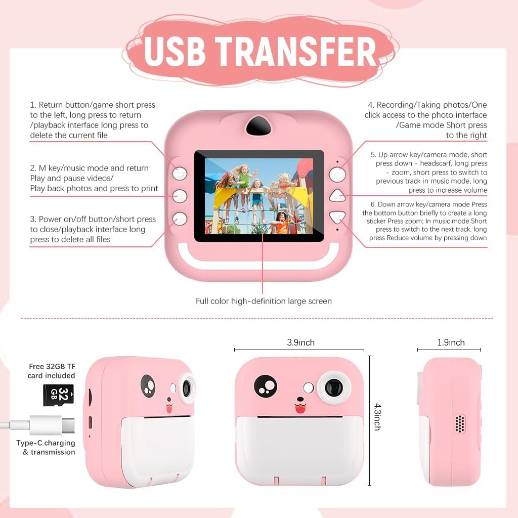 HASTHIP Instant Camera for Kids, 2 in 1 Mini Camera Ink Free Printer, with 35GB TF Card and 2.4 Inch Color Screen Instant Print Camera for Kids, Kids Camera for Kids 3-14 Years (Pink)